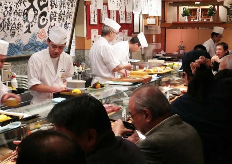 “Just look for the longest lineup in Yakitori Alley and that’s the entrance to Midori Sushi,” says the delightful Nori before disappearing into the commuter throng at Tokyo Station.